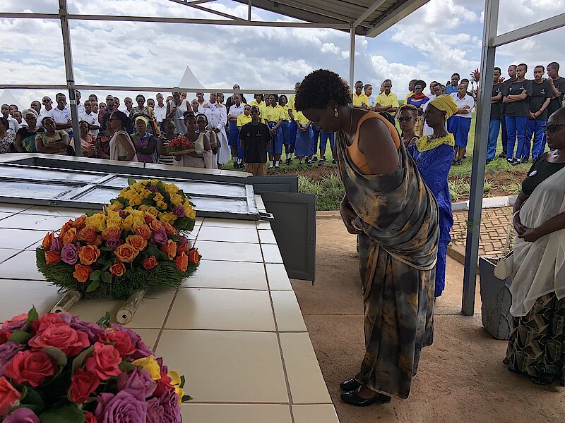 Igikorwa cyo kwibuka abana n’abagore gisojwe no gutura indabo imibiri ishyinguye mu rwibutso rwa Jenoside rw’umurenge wa Ngoma no kubunamira.
