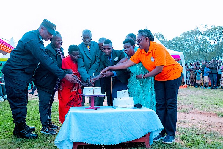 Imiryango yasezeranye kubana byemewe n'amategeko yakatanye “gateau” n'abayobozi.