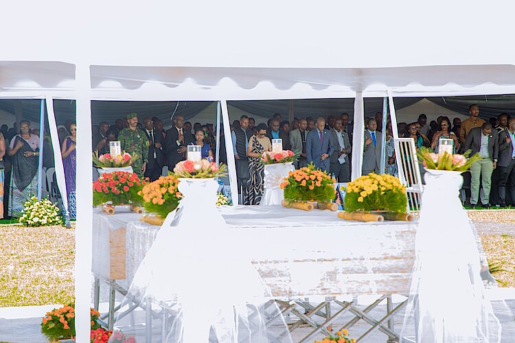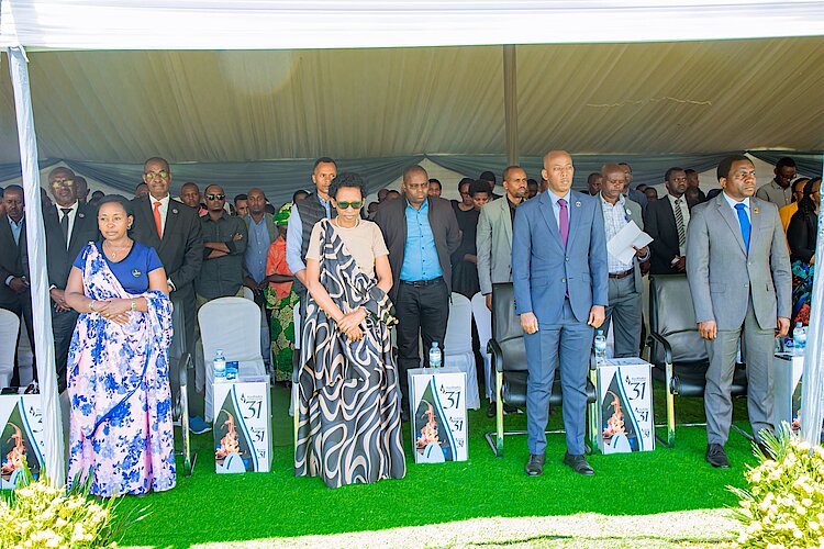 Perezida w'Umutwe w'Abadepite Gertrude Kazarwa n'abandi bayobozi mu nzego zitandukanye bifatanyije n’imiryango y'abarokotse Jenoside yakorewe Abatutsi n'abaturage b'Umurenge wa Gishamvu mu gikorwa cyo kwibuka ku nshuro ya 31 Jenoside yakorewe Abatutsi mu 1994.